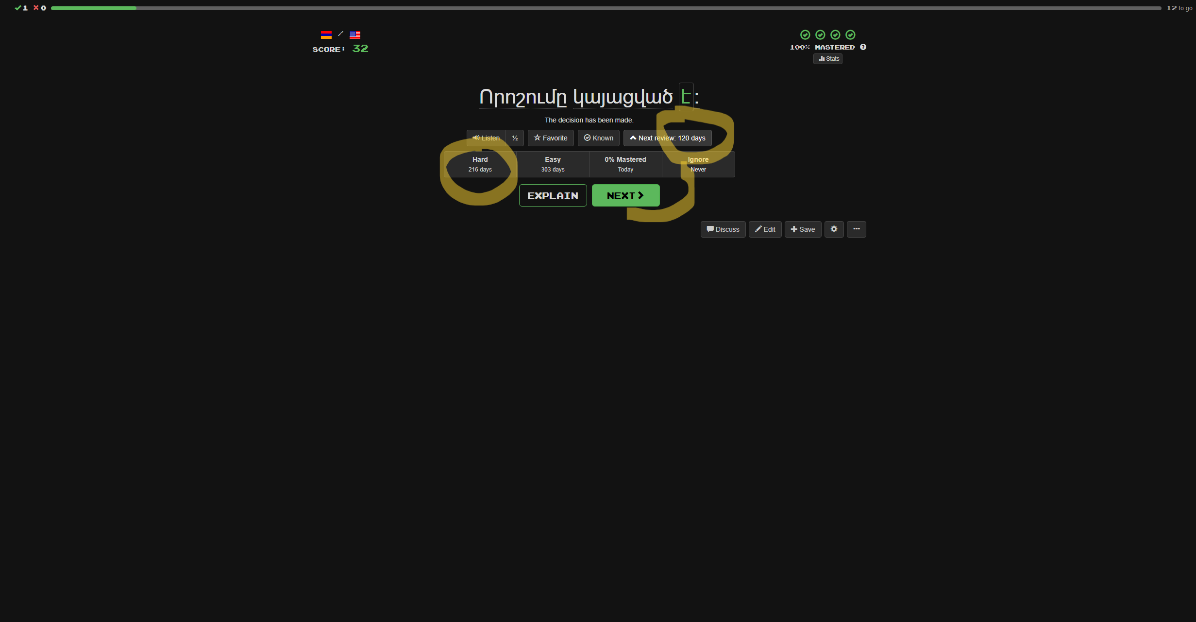 For comparison, the first time I see (and correctly answer) a sentence after I’ve gotten it up to 100%, the previous interval is 150 , the hard interval is 180, and the easy interval is 252. This gives increase rates of 1.2 for hard and 1.68 for easy.