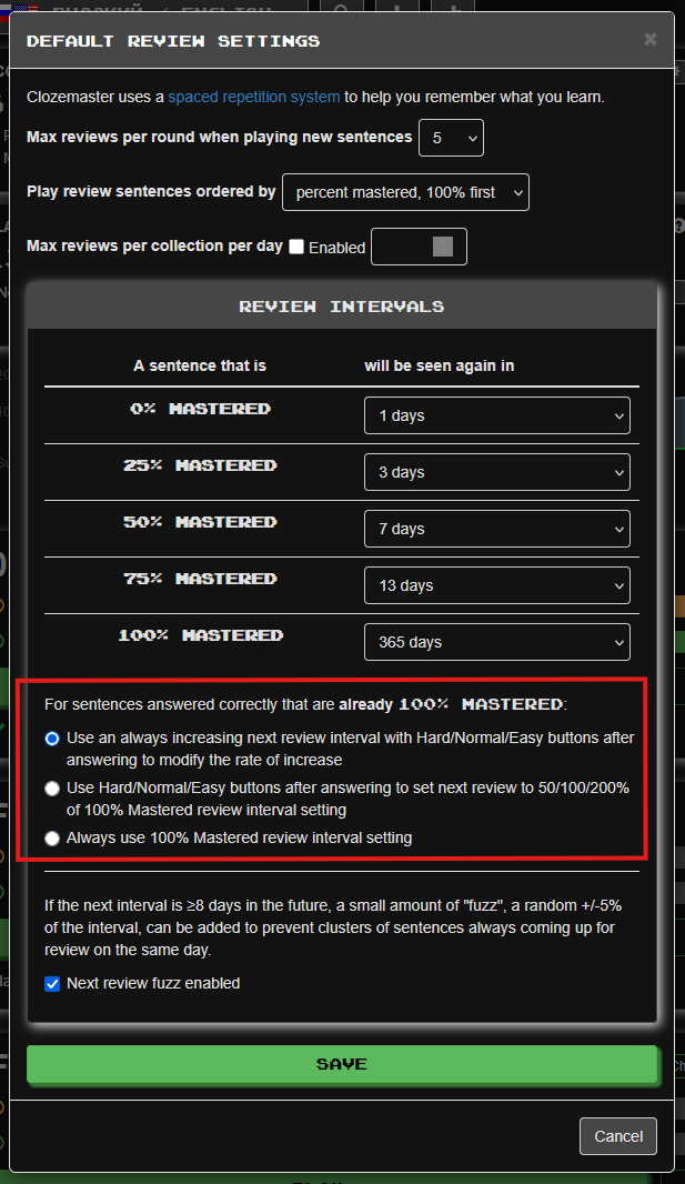 I still see the section with the three options for sentences that are already 100% mastered. I’m not sure why this is not showing up in your dialog.