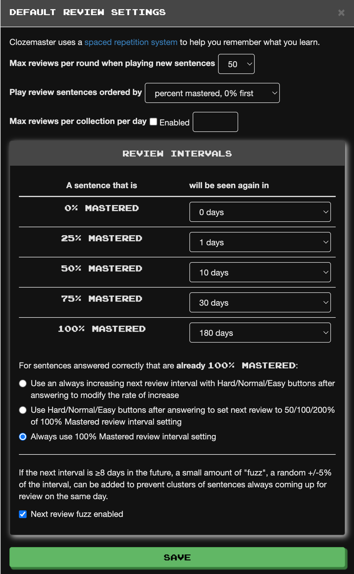 thanks, i changed “play review sentences ordered by”=0% first and now i see the ‘next’ button when i review. I wanted it as 75% mastered first so i could get rid of those that are close to mastered first