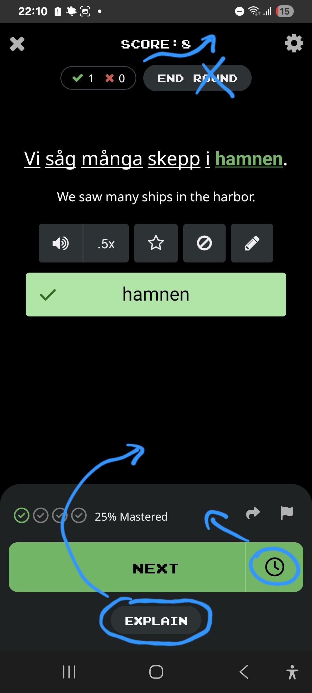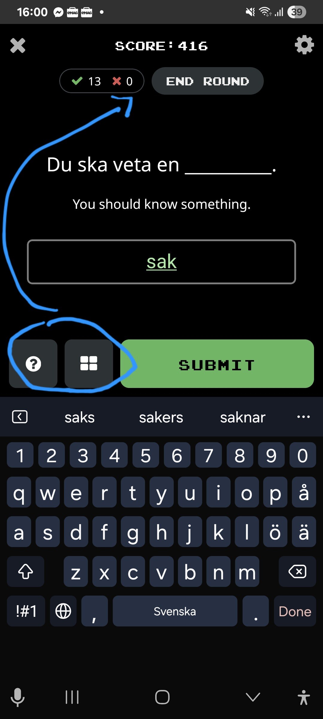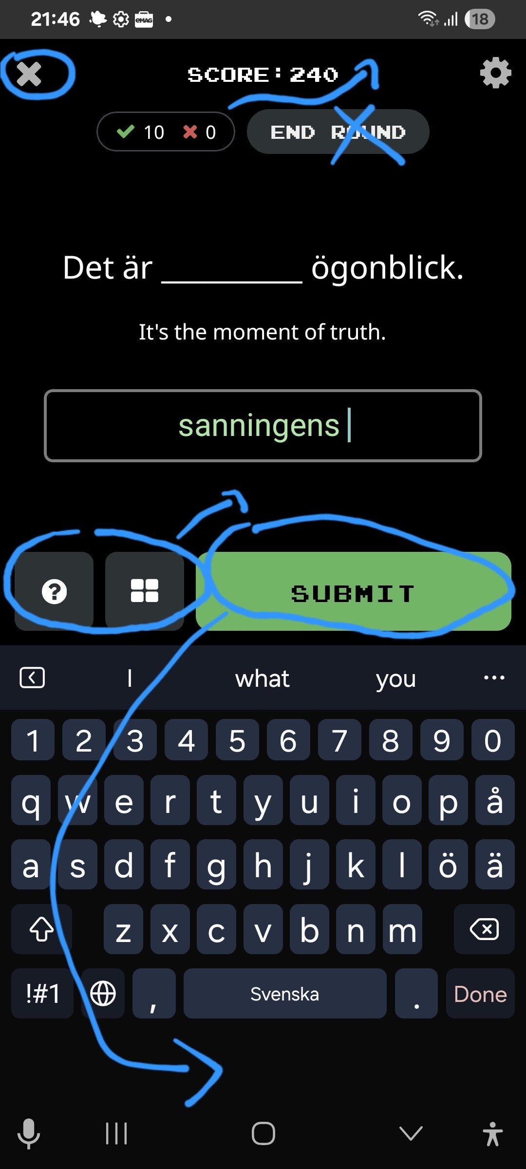 My suggestion is to keep the SUBMIT and NEXT buttons without any other icons next to them (left or right). And for them to be wide (not narrow) because it is easier to play that way. Like I said, muscle memory plays a huge role in how each of us play. I just got used to touching these buttons (SUBMIT and NEXT) with the right and left thumbs.