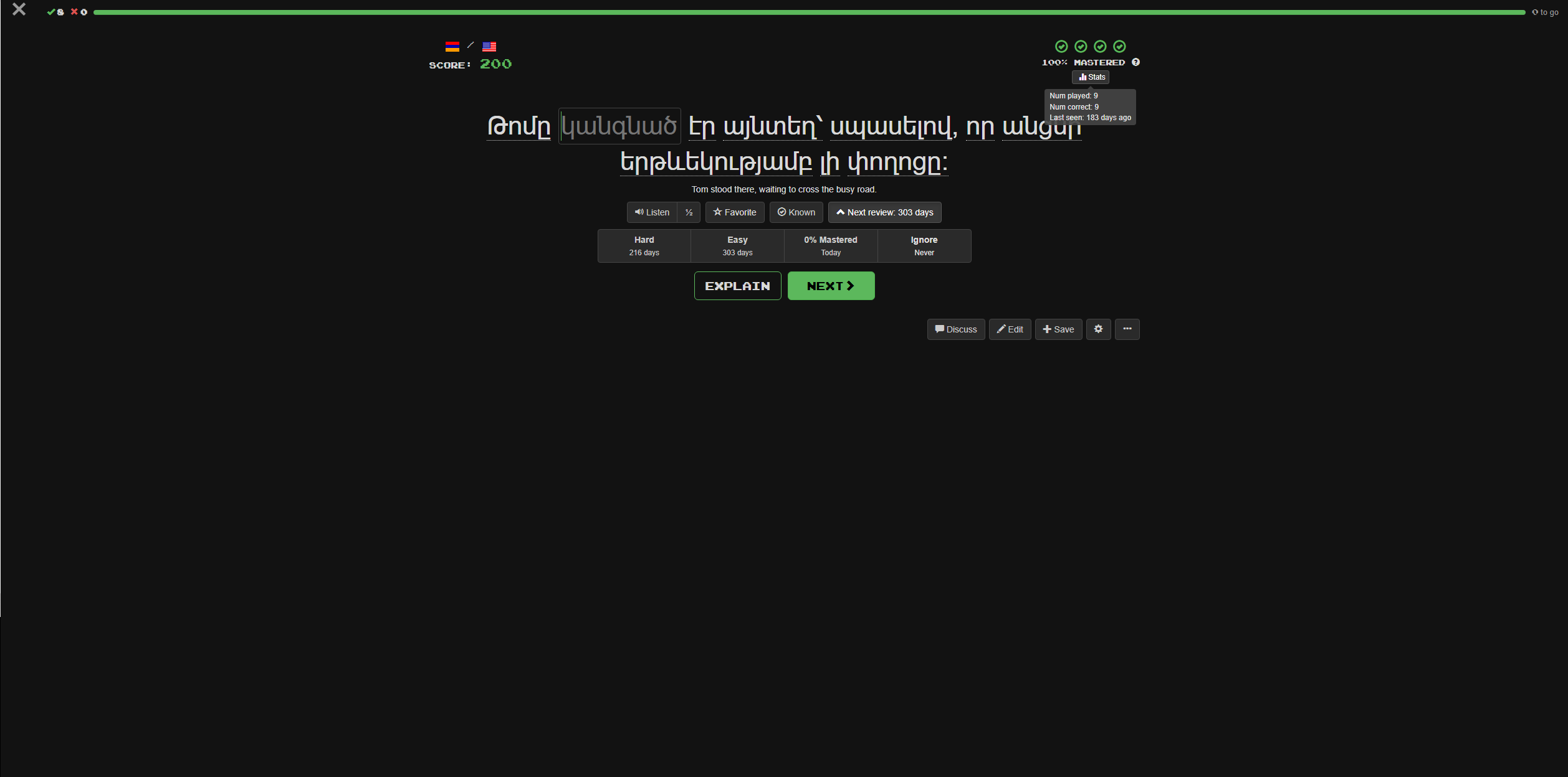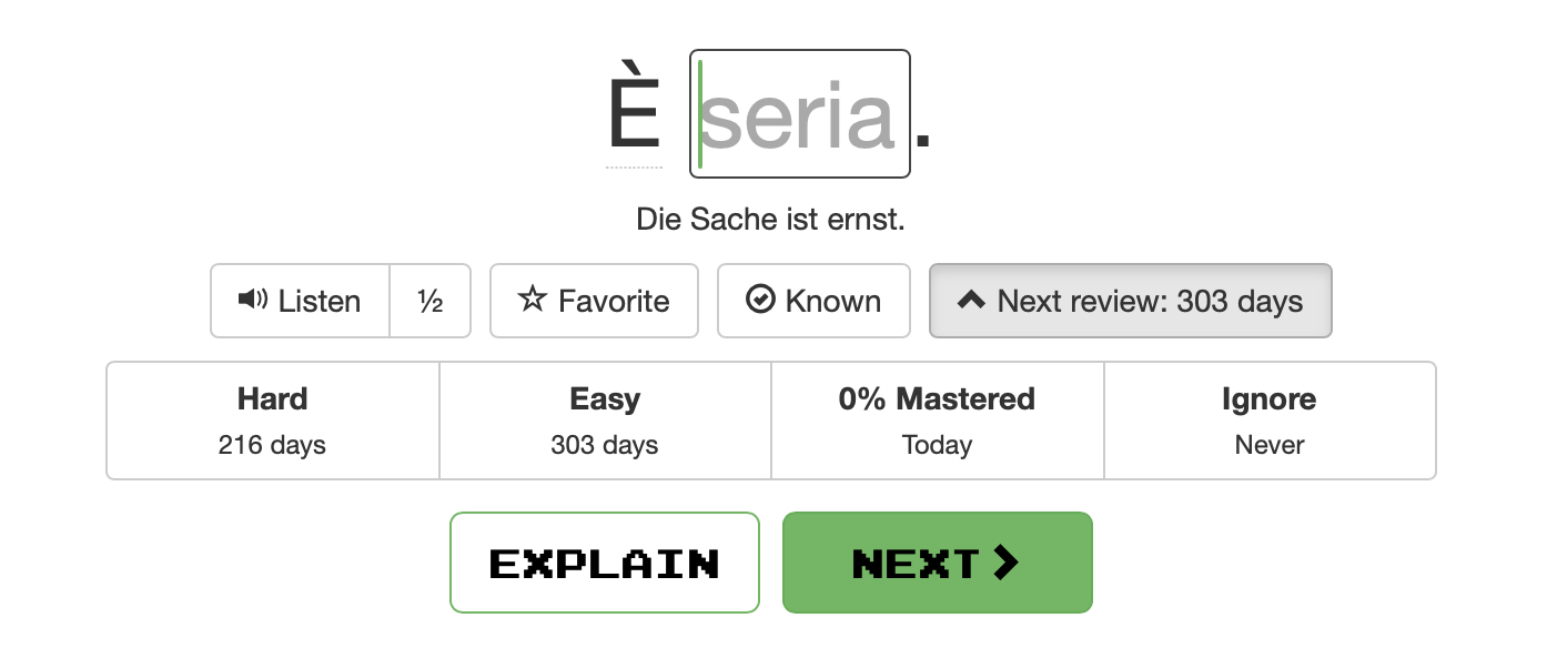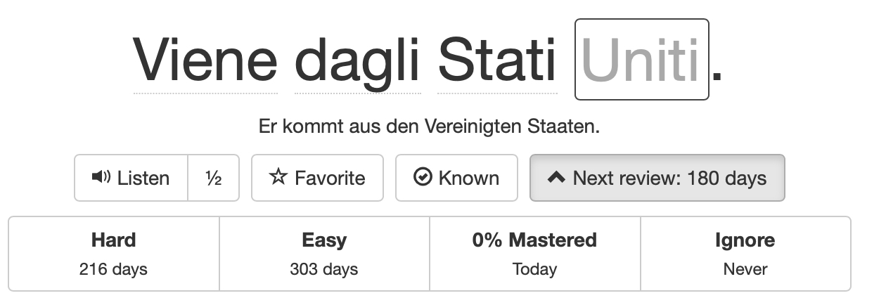 Super-confusing: In Listening mode, “Next” doesn’t always mean “Next sentence”. Sometimes it means “Press this button in order to see the ‘eye’ button that you can then press to see the translation.” Why???