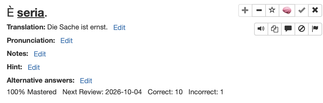 Not sure where to put a compliment so I’ll put it here. Just as I was thinking “Hmm, this seems a bit too easy, perhaps move on?”, a friendly suggestion popped up “Why not try a harder collection?” Che coincidenza, first time I’ve seen this! I rather liked it and moved on to Fast Track Level 10. Little things eh …