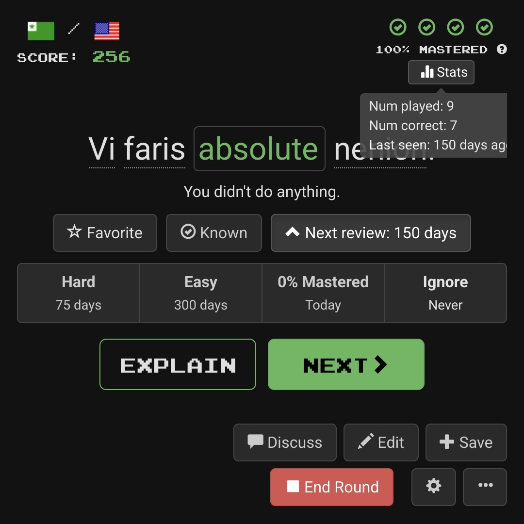 Usually when I mark an item as known, I immediately want to move on to the next sentence, but that isn’t always the case. Sometimes I might mark an item as known, and then look at the sentence, perhaps examine other parts of the sentence, use the wiktionary interface, or else choose to mark the sentence (and possibly other sentences with the same cloze word) as “Ignore”. I can no longer do any of these things with the new interface, as the sentence disappears before I can do anything. I would have to change to only marking a sentence as known as the last thing that I do which would take some getting used to.